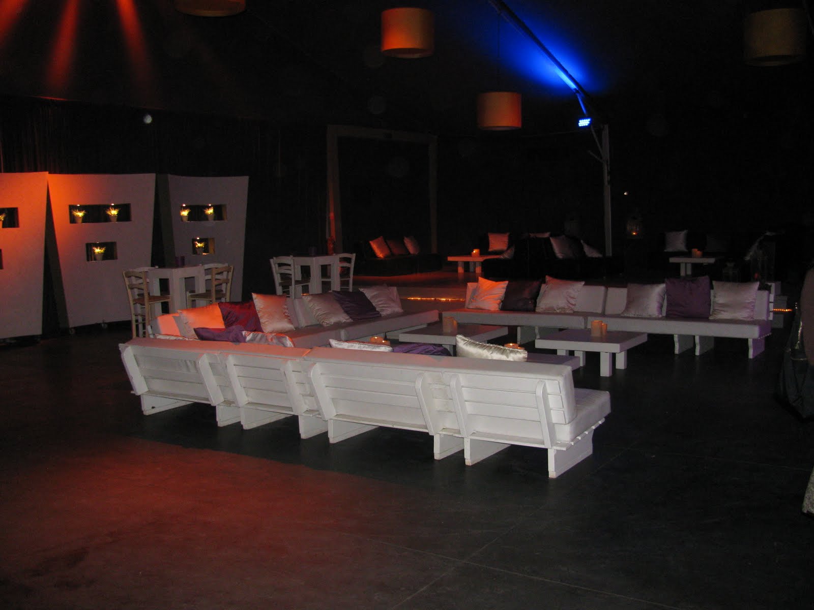 Here is a very modern lounge white leather seating section at a wedding, it has comfortable couches, bright lite colors, and interesting art. A great place for people to dit, relax, have a drink, and watch the dance floor…