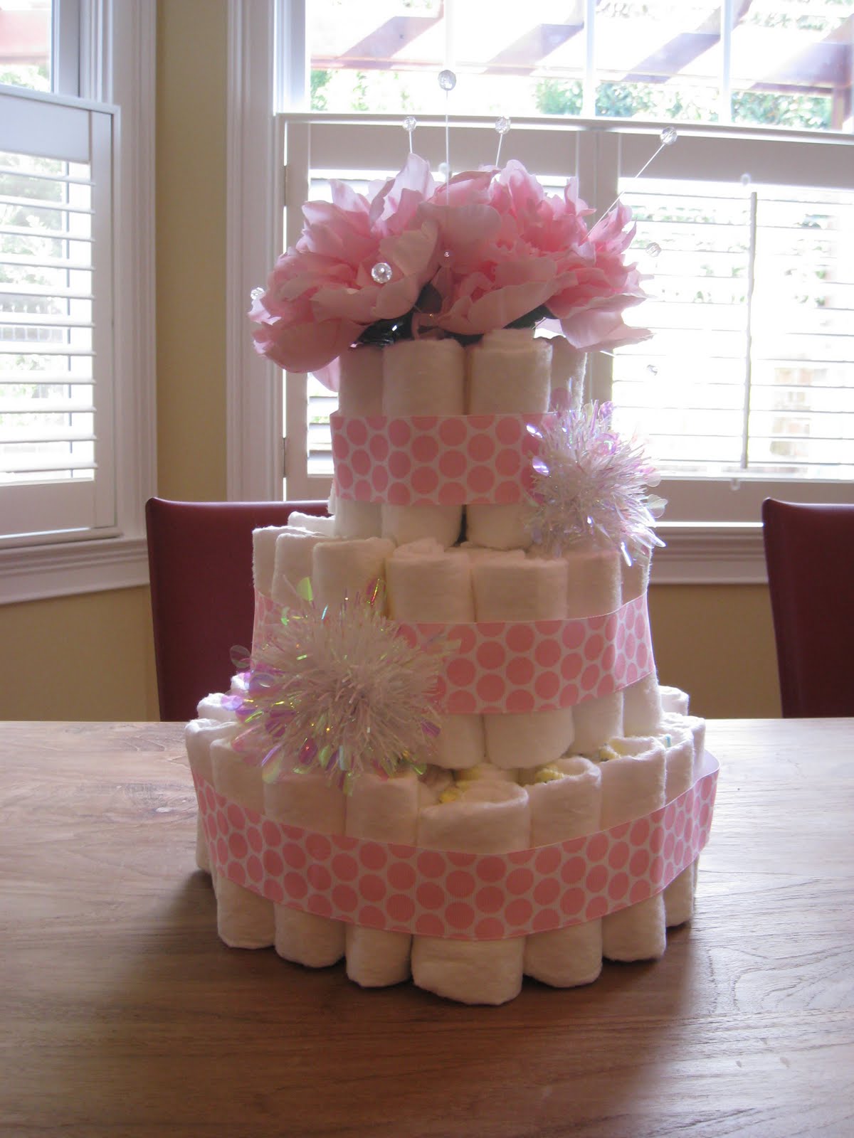 All the credit for this creative centerpiece goes to one of my closest friends. An adorable baby shower diaper cake for a very lucky little girl to be. It was so cute on the table and other then the time to roll each of the diapers, she said it was pretty easy. A roll of ribbon and a few flowers later – all set! Precious and a gift mom can use…