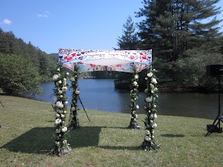 A beautiful hand made chuppah covering over beautifully decorated poles covered in florals. Very pretty view can’t hurt as well!