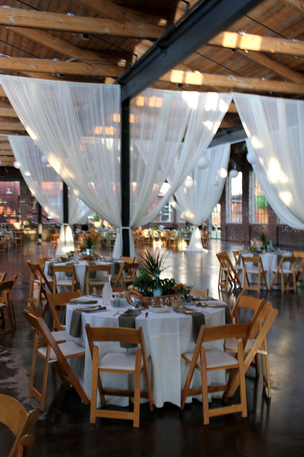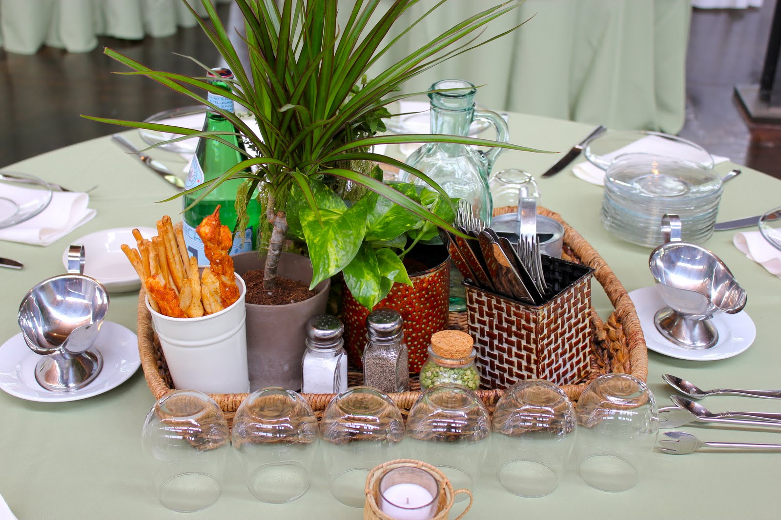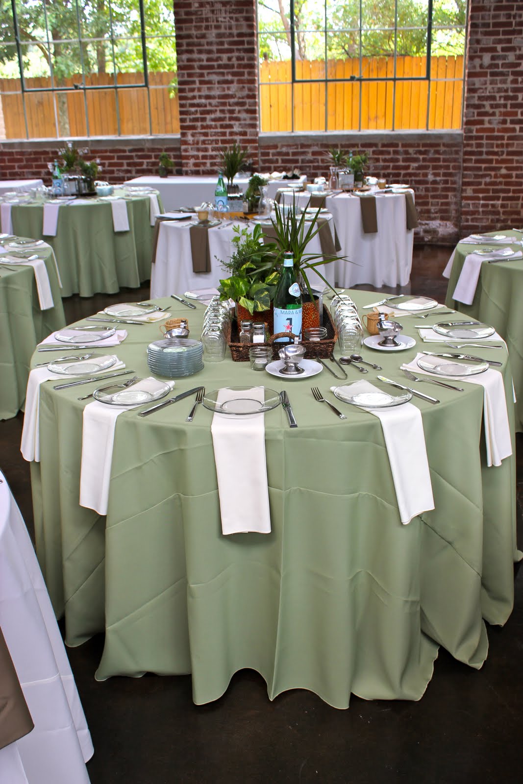 Shades of Green, Ivory and Brown created a simple yet elegant evening. The natural light that came through the windows at Puritan Mill gave the perfect look. We worked very hard to make this event earth friendly with the green perrier bottles acting as the table numbers.