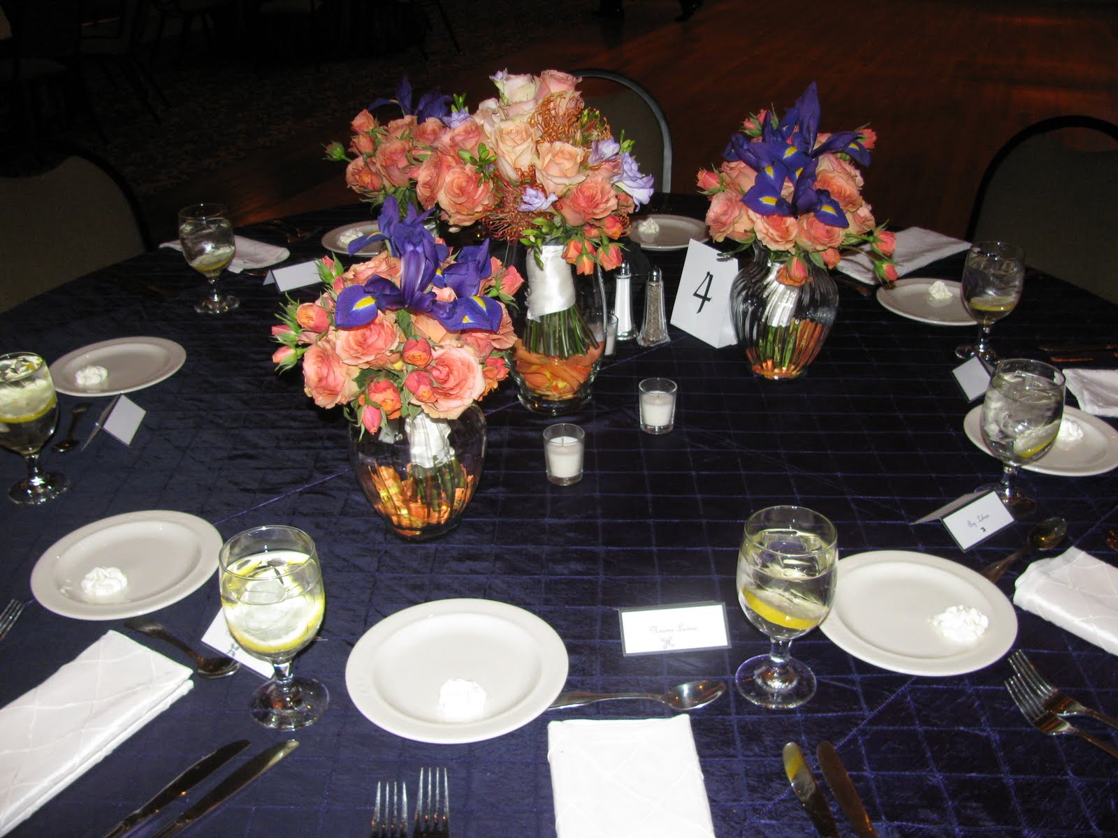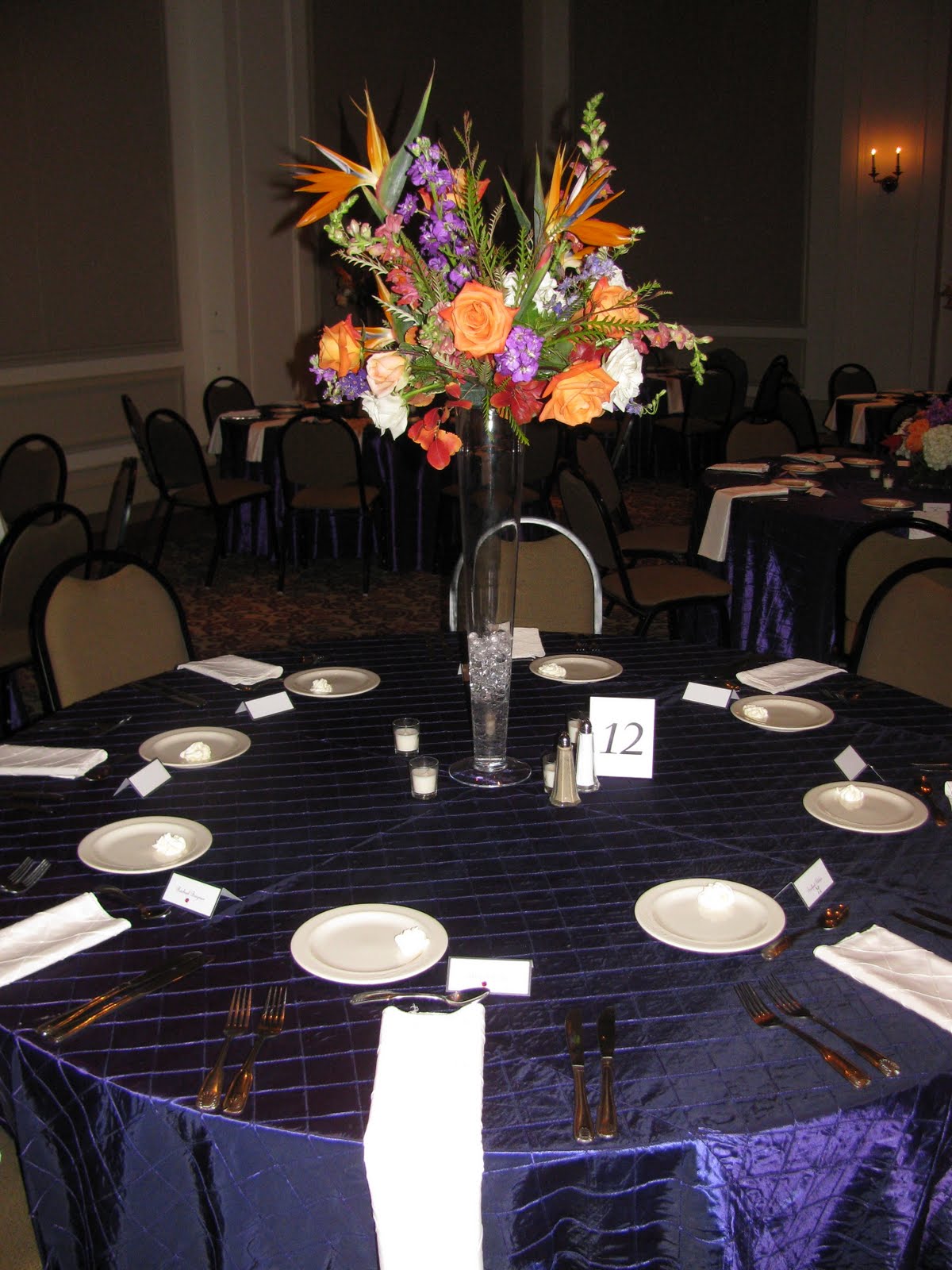 The bride and groom wanted salmon-colored and purple flowers to pick up the colors from the birds of paradise. Flowers by Joan incorporated other fall colors through the use of real fallen leaves, with two different arrangement designs for centerpieces scattered on tables throughout the venue.