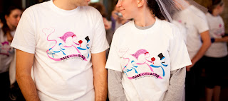 The back of her shirt said “Runaway Bride” and his said “Cold Feet!”