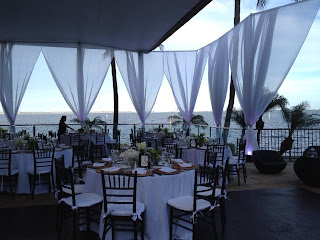 With only railing and dividers separating wedding family and guests from the water, warm breezes brought the fragrance of the ocean that permeated the area where the reception was held. Check out the flower arrangements and elegant table settings that enhanced the sea-side decorated ambiance!
