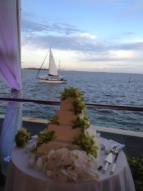 With a view of a sailboat, the ocean waves gently flowing and the colors of sunset, the wedding cake display table is perfectly positioned. The wedding cake with green leaf garnish and the bride’s orchid bouquet in front is further proof of attention to every detail that the Grove Isle Hotel and Spa provided for this wedding celebration.